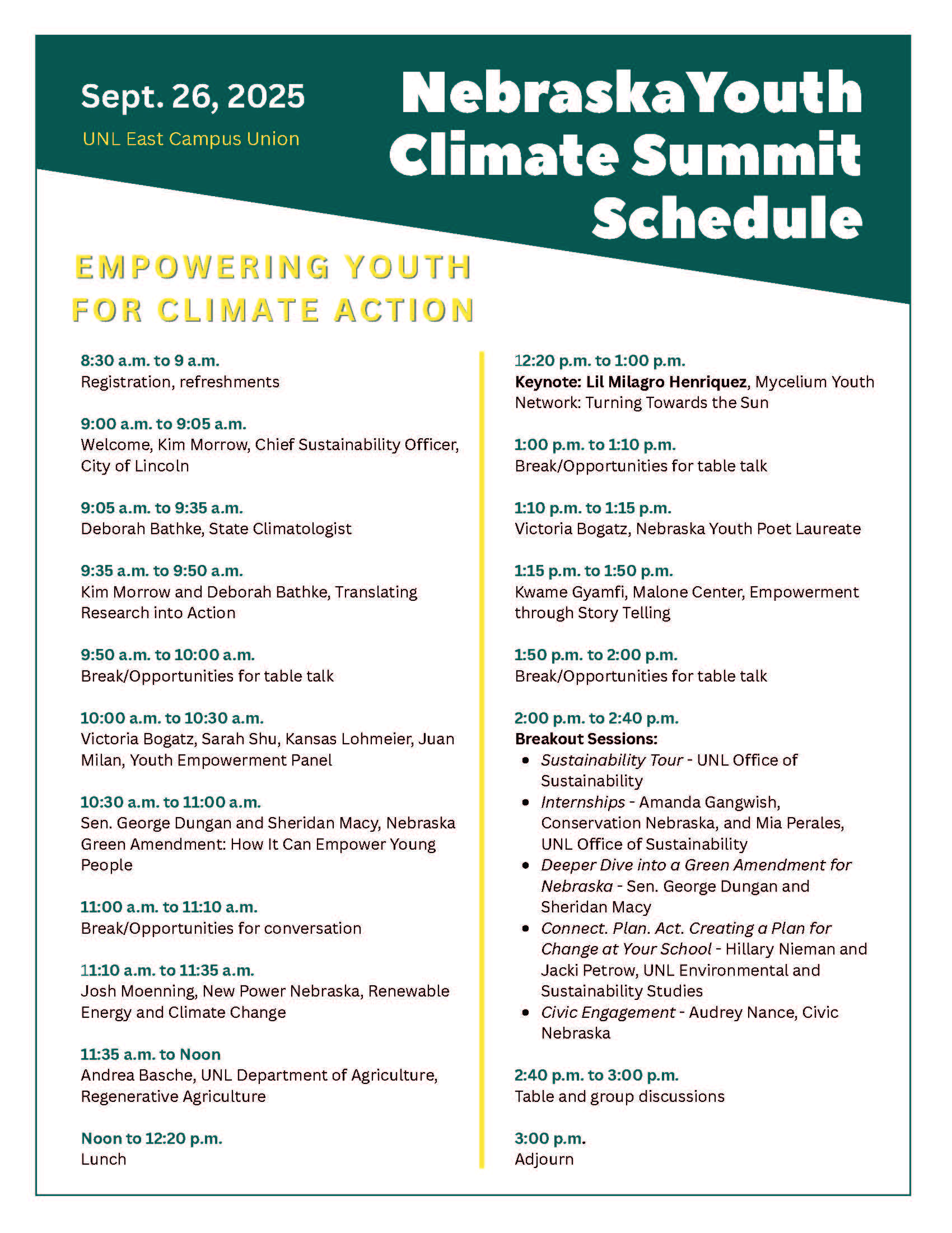The Nebraska Youth Climate Summit provides opportunities for education on issues such as the impact of climate change on Nebraska, agricultural methods to respond to climate change from local experts and environmental justice impacts of climate change.